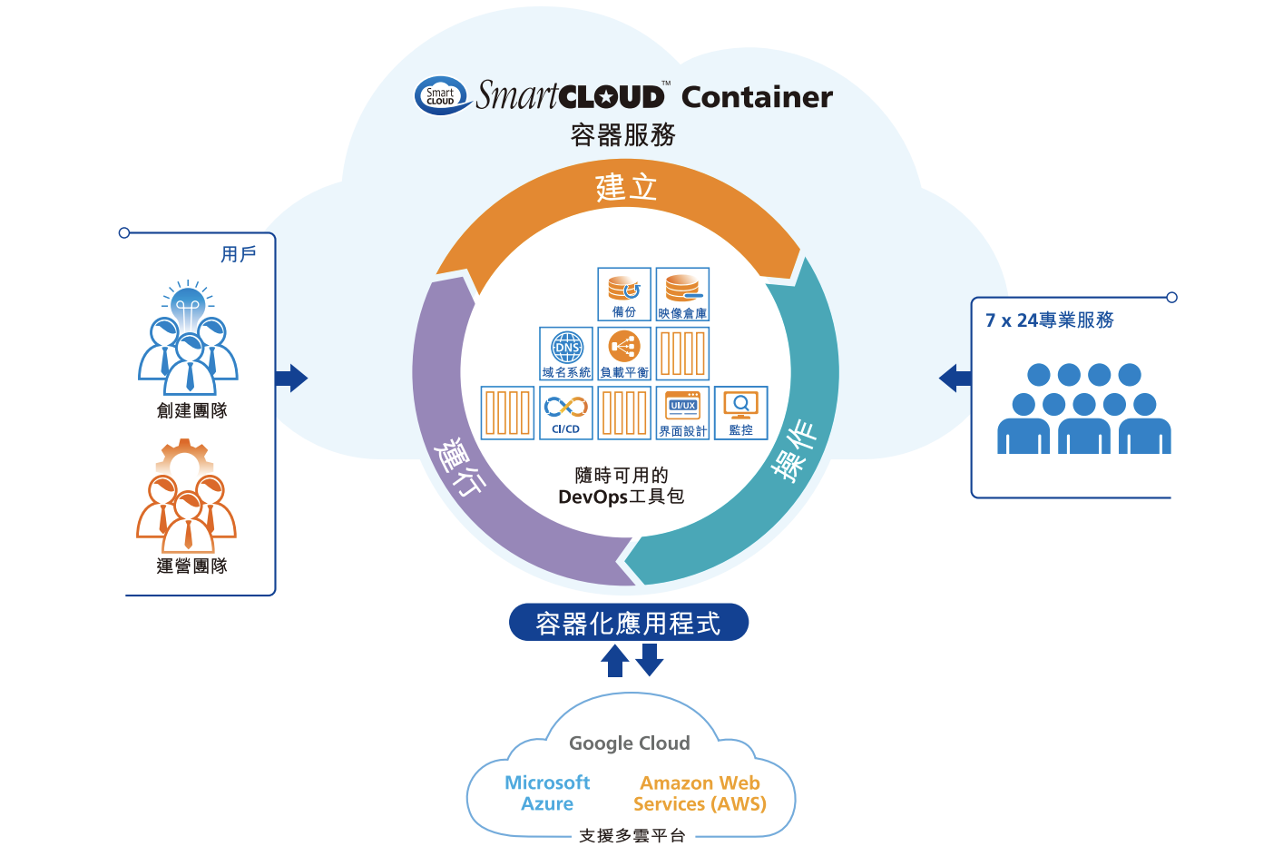 SmartCLOUD™ Container容器服務,是建立於產業標準及全面託管的平台即服務,有別於自建K8s繁瑣複雜的建構流程,SmartCLOUD™ Container容器服務提供多元的DevOps套件,開發員和管理員兩種介面,以及應用備份/恢復方案,協助企業能更快開發、部署應用程式,搭配便利的管理介面與7x24全天候容器託管服務,確保運作環境的安全保障。