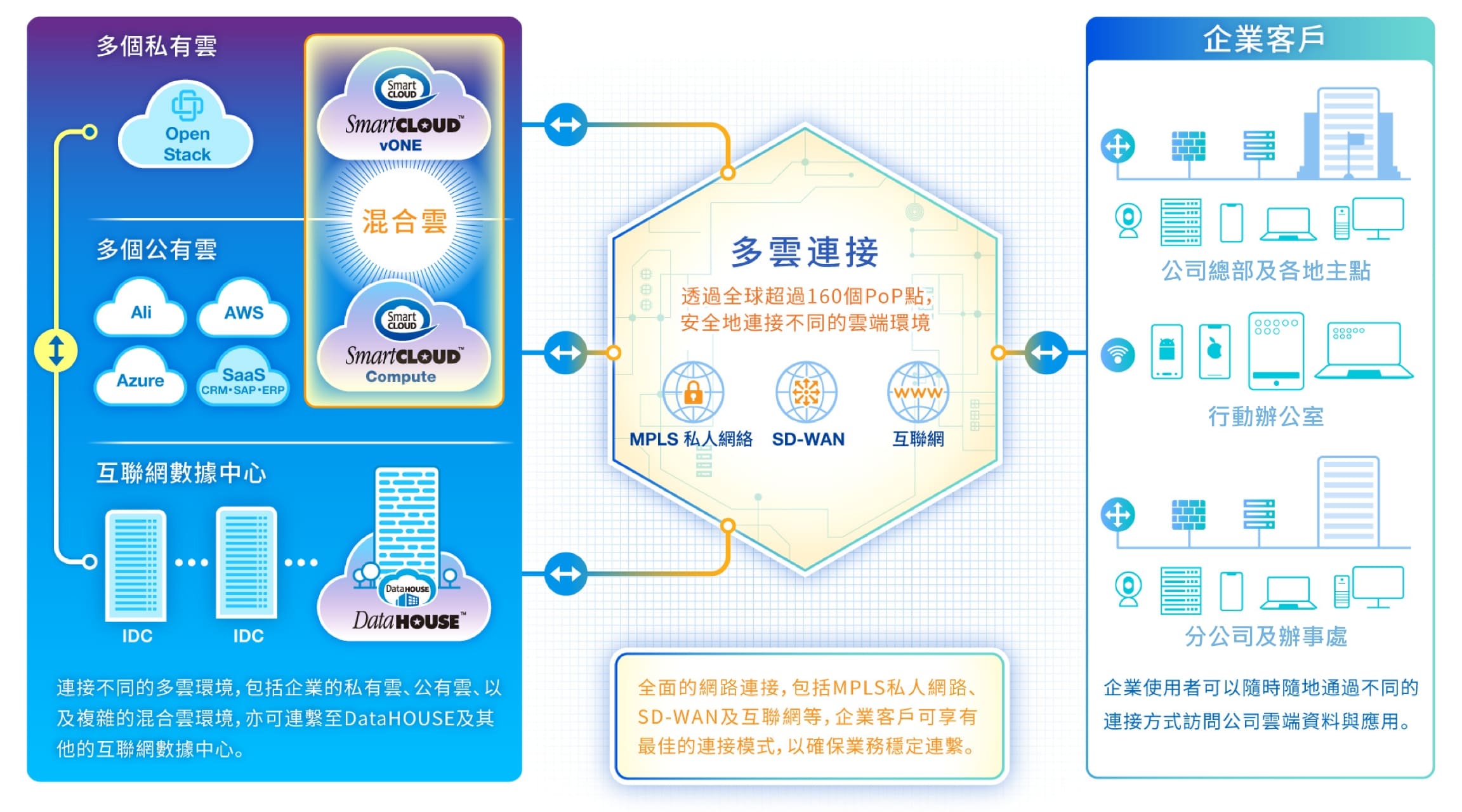 透過多雲連接服務,讓企業可無縫及安全連接不同的雲服務平台,輕鬆管理各項雲服務,盡享最佳雲服務表現,減低營運成本,提升數據安全,令日常業務時刻暢順運作。