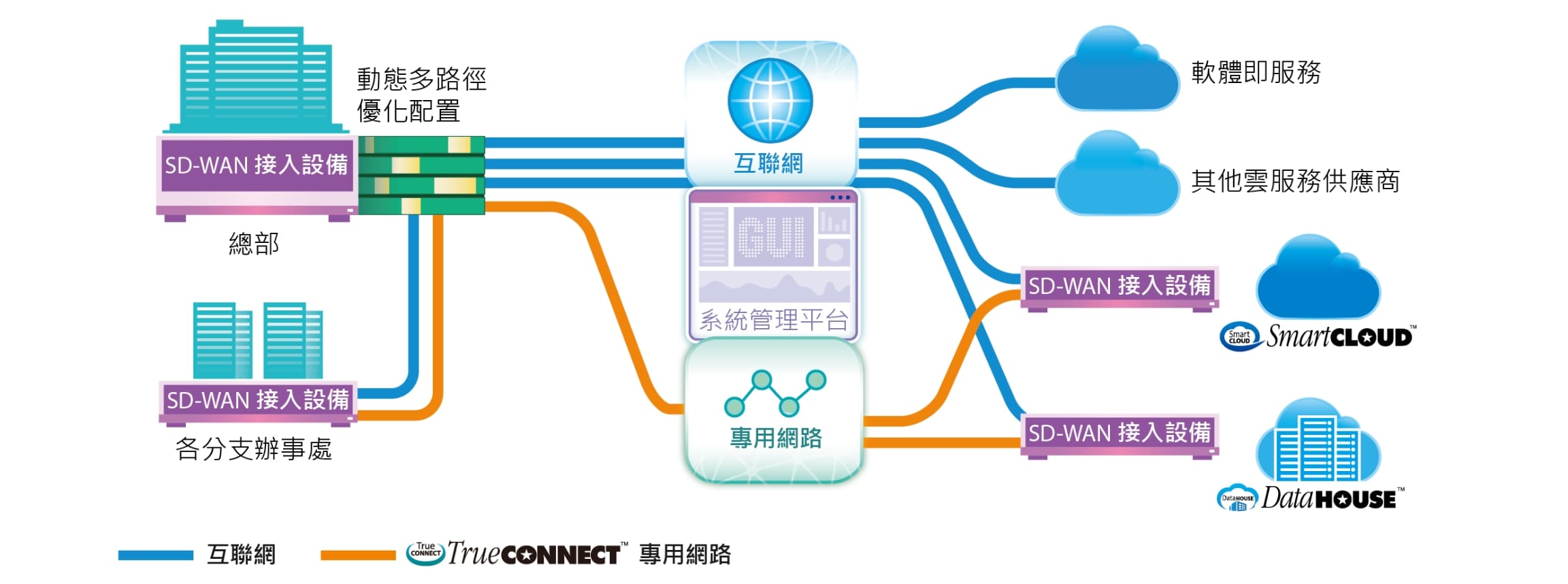 TrueCONNECT™ Hybrid 可簡化分支辦事處網路,並且確保最佳應用程式效能。透過 SD-WAN (軟體定義廣域網路)技術,TrueCONNECT™ Hybrid 能創建混合廣域網,將多種接入技術整合至單一分集路徑。