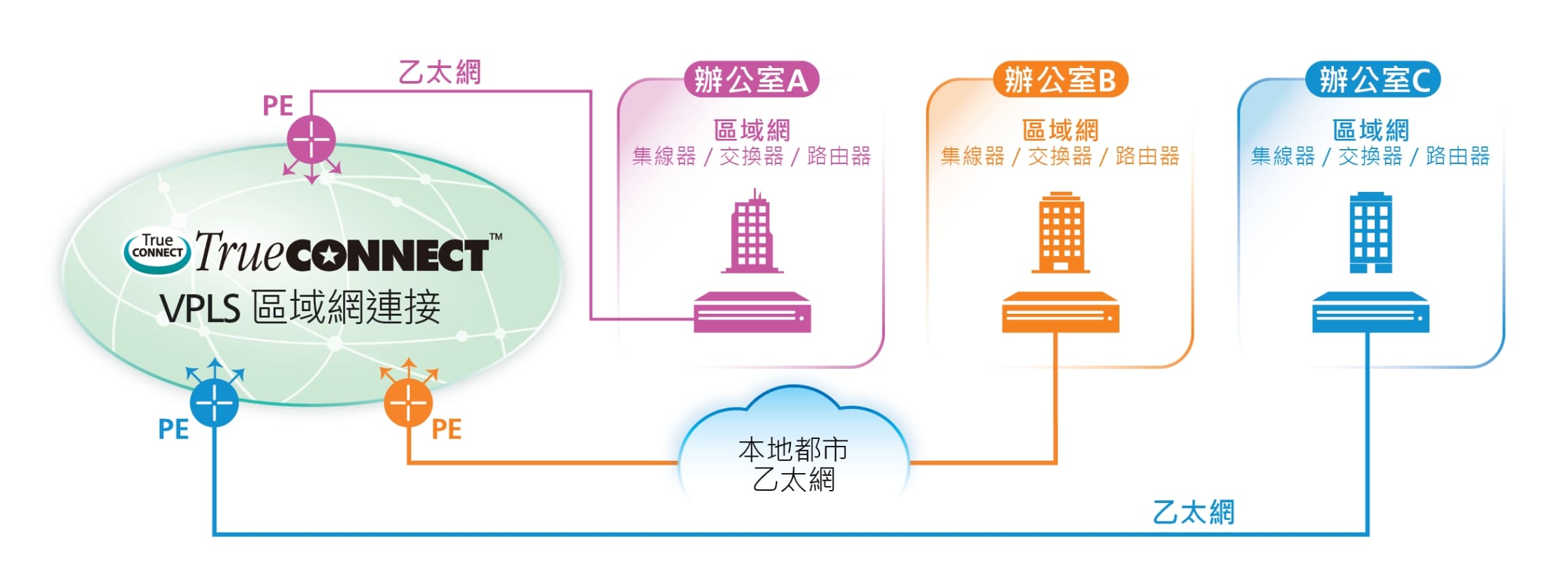 TrueCONNECT™ Premium 專用區域網服務 (VPLS) 性能卓越,它利用乙太網路架構提供可擴展、高速和安全的專用區域網連接。建立於乙太網的專用網路服務採用先進的全連接分布及高冗餘技術,而 TrueCONNECT™ 的多協議標籤交換 (MPLS) 網路則充當單一乙太網交換器,連接多個辦公室。所有辦公室將透過 VPLS 顯示在相同的專用區域網上,不受地域所限。同時,客戶可以完全控制路由和 IP 地址,令部署、持續尋址及應用管理得以簡化。TrueCONNECT™Premium VPLS 提供建基於乙太網的廣域網接口,提供簡單、靈活和快速的多站點部署。