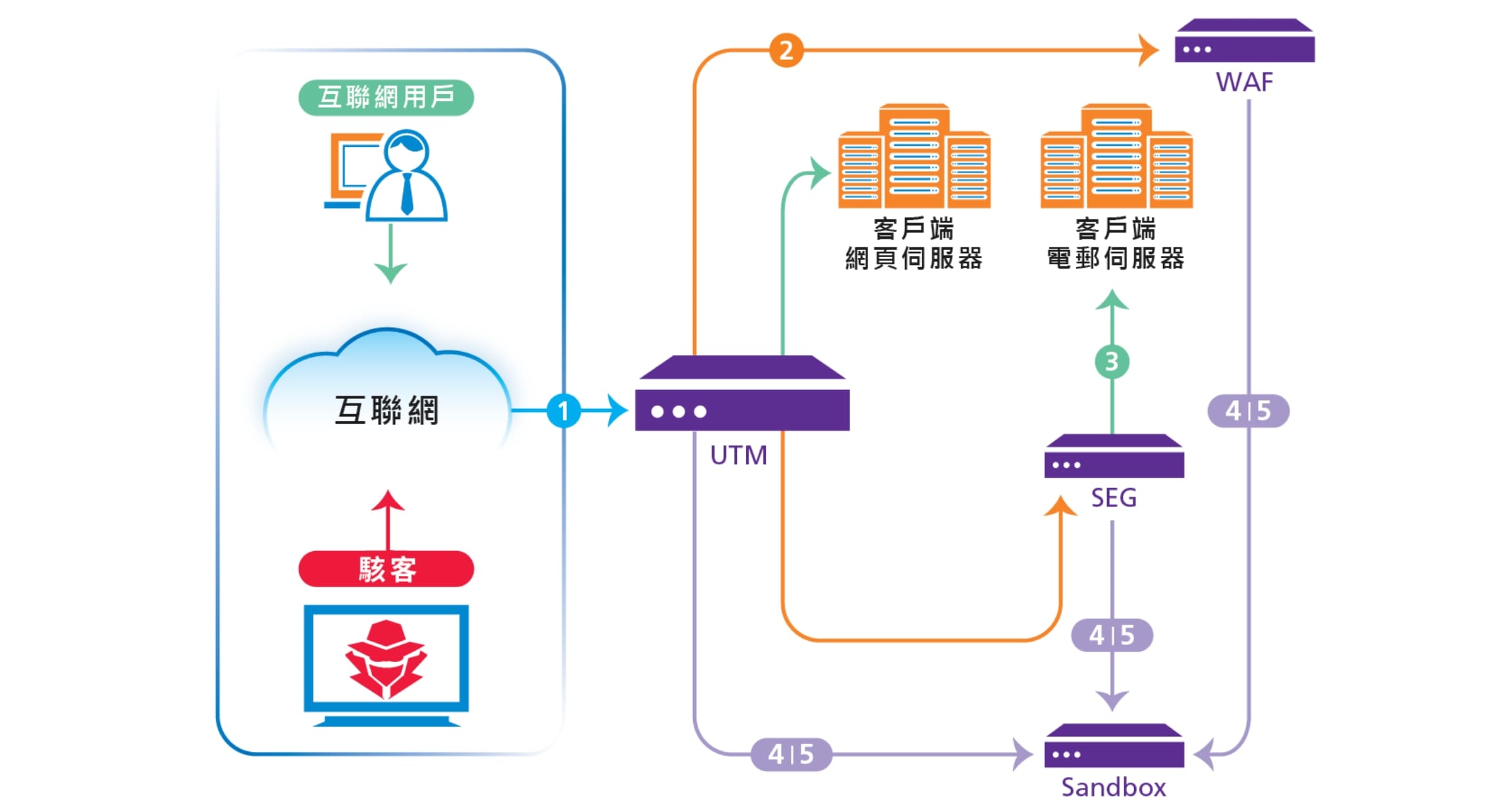 無間斷運作的分層安全保護系統,包括統一威脅管理 (UTM)、網路應用防火牆 (WAF)、電子郵件安全設備 (SEG)、沙盒及全天候的託管式安全服務 (MSS)