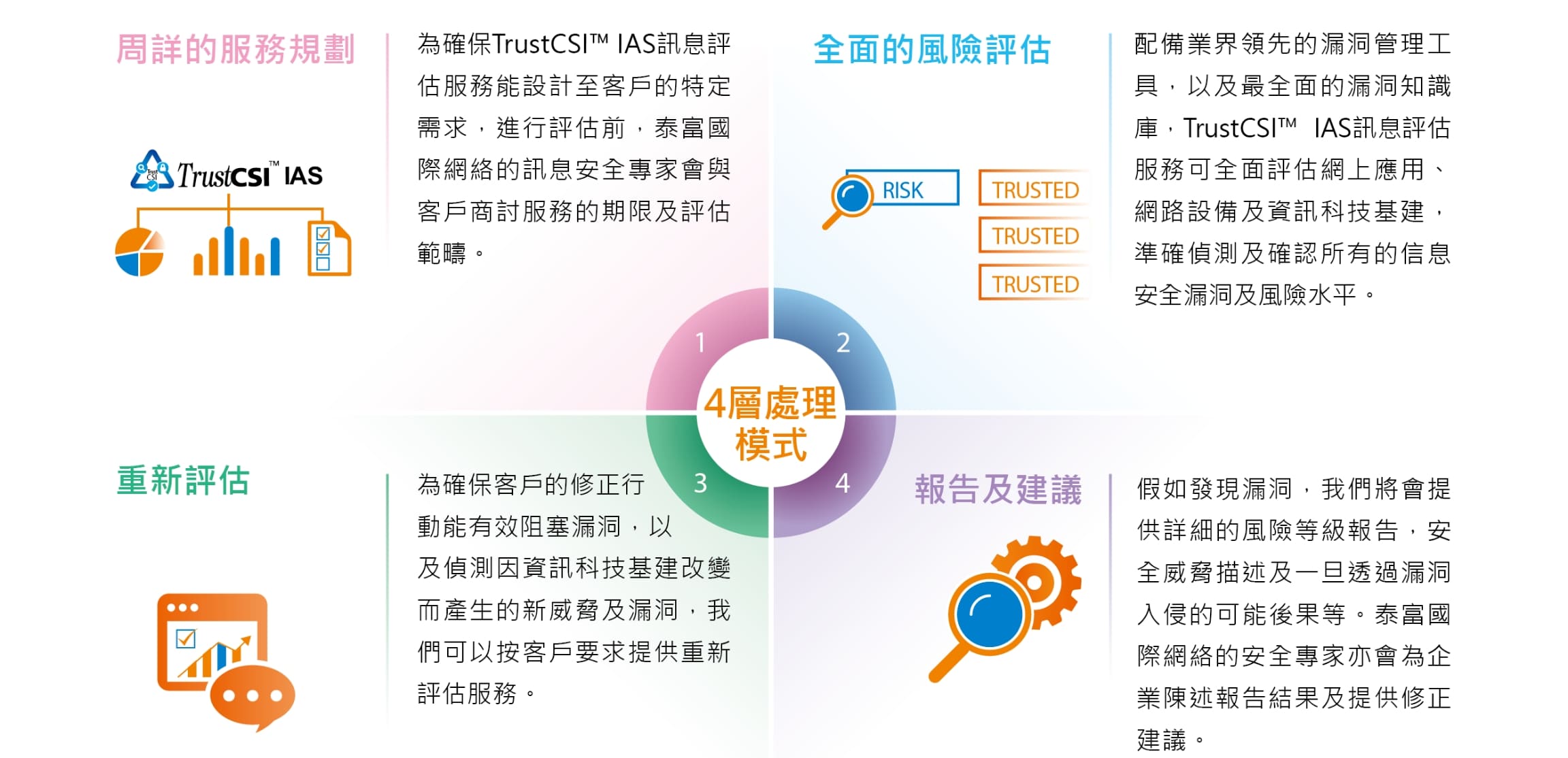 隨著 IP 科技的廣泛應用,網路已成為經營業務必不可少的基礎建設,網路運作健康與否大大影響企業的運作。要確保企業網路時刻運作安全順暢,TrustCSI™ IAS 資訊評估服務讓企業可確定網路基礎建設及網路應用中潛在的損害漏洞,並提供報告及修正建議,確保企業能先發制敵、防患未然。