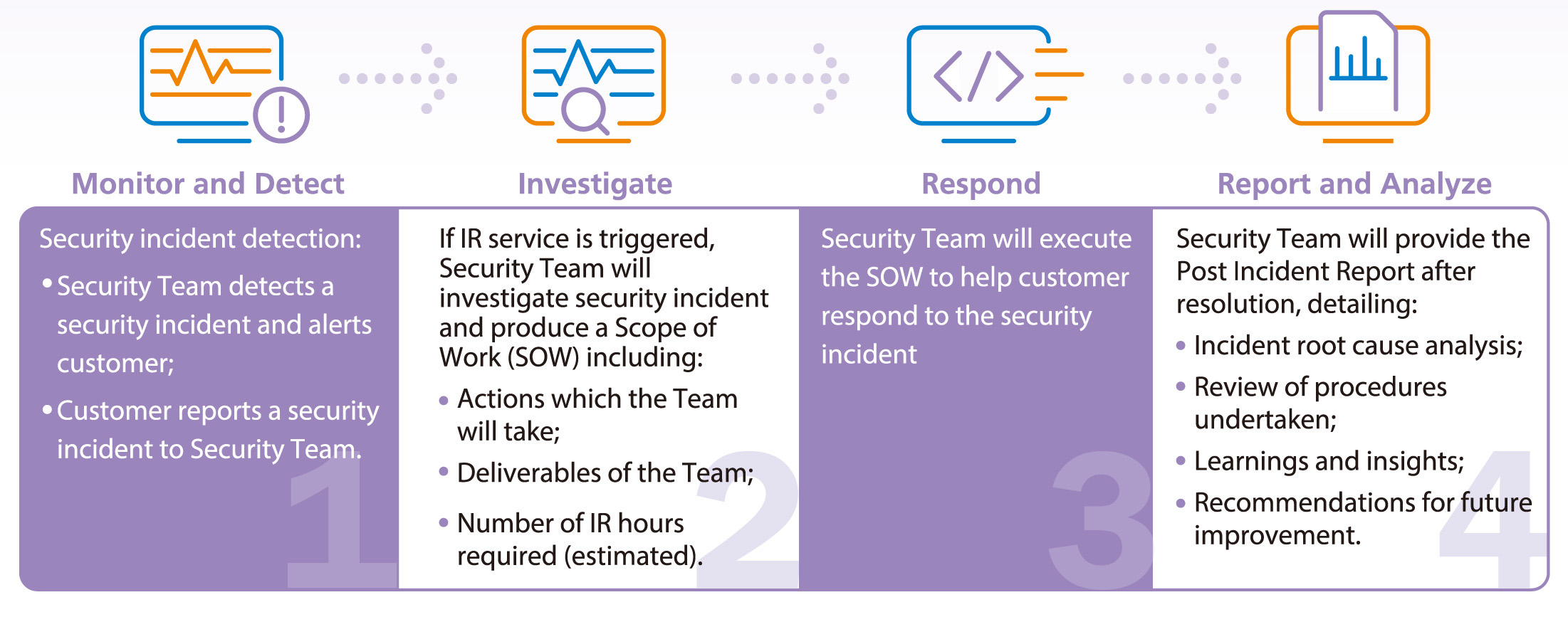 通常而言,資訊安全事件是在沒有警告的情況下發生。即使被發現,組織亦可能沒有足夠的資源或專業知識來有效地處理及免除攻擊,從而造成巨大和持續的損失。安全事件回應 (IR)擁有 24x7x365全天候訓練有素的資訊安全團隊,可提供快速回應,及時採取專業行動,為客戶調查和補救攻擊。解決情況後,資安團隊也會向客戶提供後續詳細的"事後報告"。