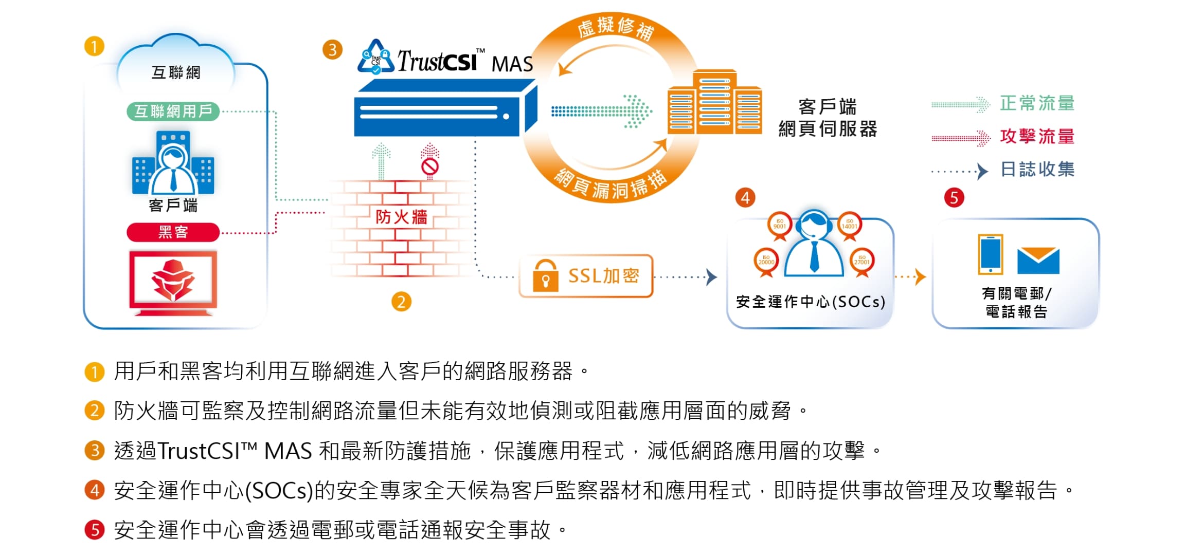 現在,透過 TrustCSI™ MAS 網路應用程式安全託管服務,企業網站便能持續運作無礙。服務配合由獲得 ISO 認證的國際安全運作中心 (SOCs) 專業團隊,提供 24x7 的持續支援和安全政策微調。再加上 TrustCSI™ MAS 設有的主動安全事件管理及回應、即時監控、特定政策、攻擊報告等多樣功能,全面保護你的網路應用和知識產權,讓你安枕無憂。
